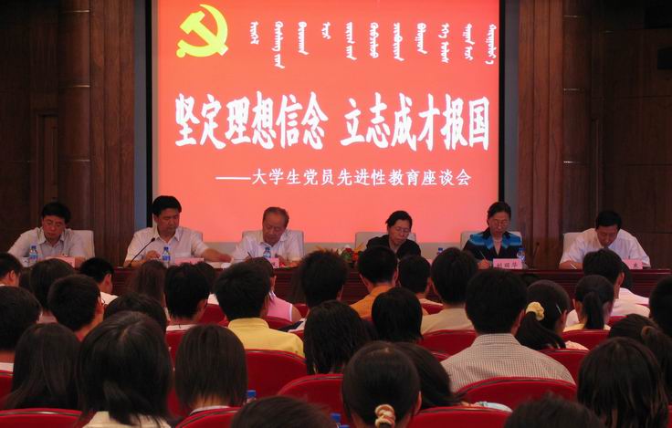 2005年7月1日下午,大学生党员先进性教育座谈会在我校图书馆学术报告厅隆重召开。自治区党委副书记杨利民、自治区党委常委、组织部长陈朋山为我校大学生党员、入党积极分子、邓小平理论研究会成员上了一堂主题为“坚定理想信念、立志成才报国”的生动党课,与大学生共庆建党84周年。自治区团委书记罗志虎、副书记罗永纲、我校党委书记刘丽华教授、校党委副书记赵东参加了会议。